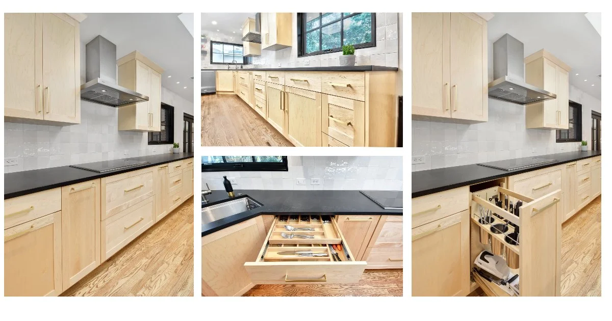 Light, natural wood tones are all the rage right now and we love how these natural maple Woodland cabinets contrast with the striking onyx colored island. We loved helping the homeowners maximize storage in this space with utensil pull outs, two-tiered cutlery drawers, paneled refrigerator drawers and more. This project was a dream to work on and we are thrilled that the homeowners are loving living in their newly remodeled space!