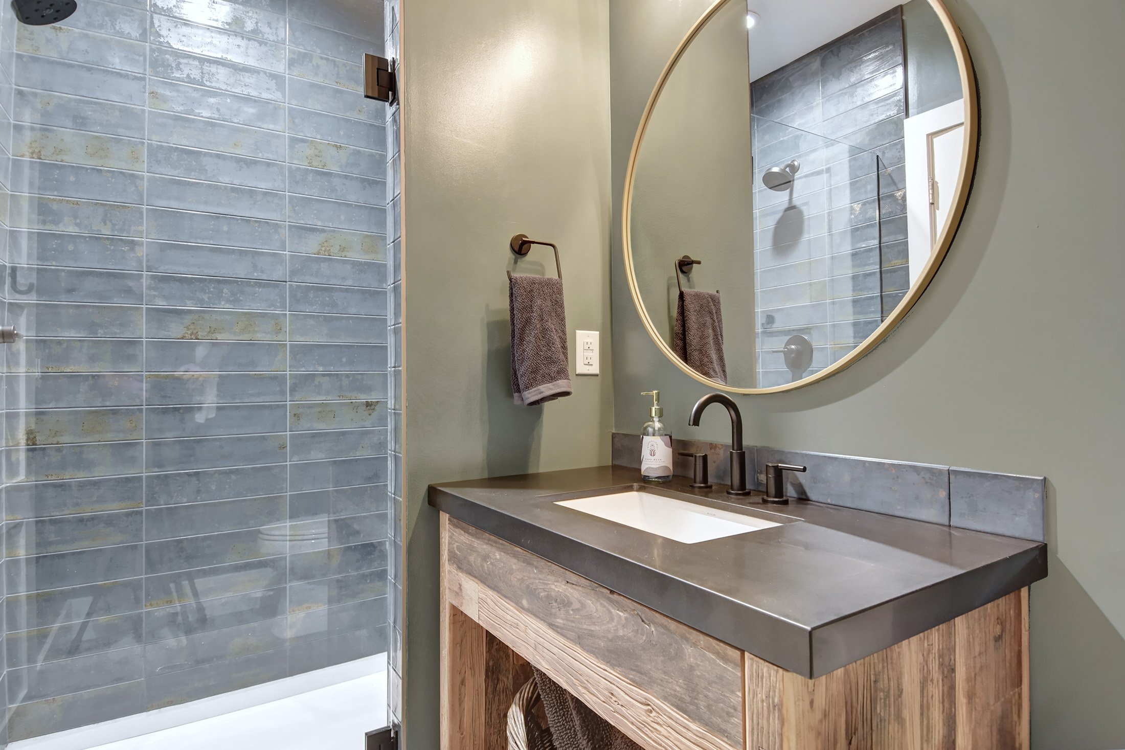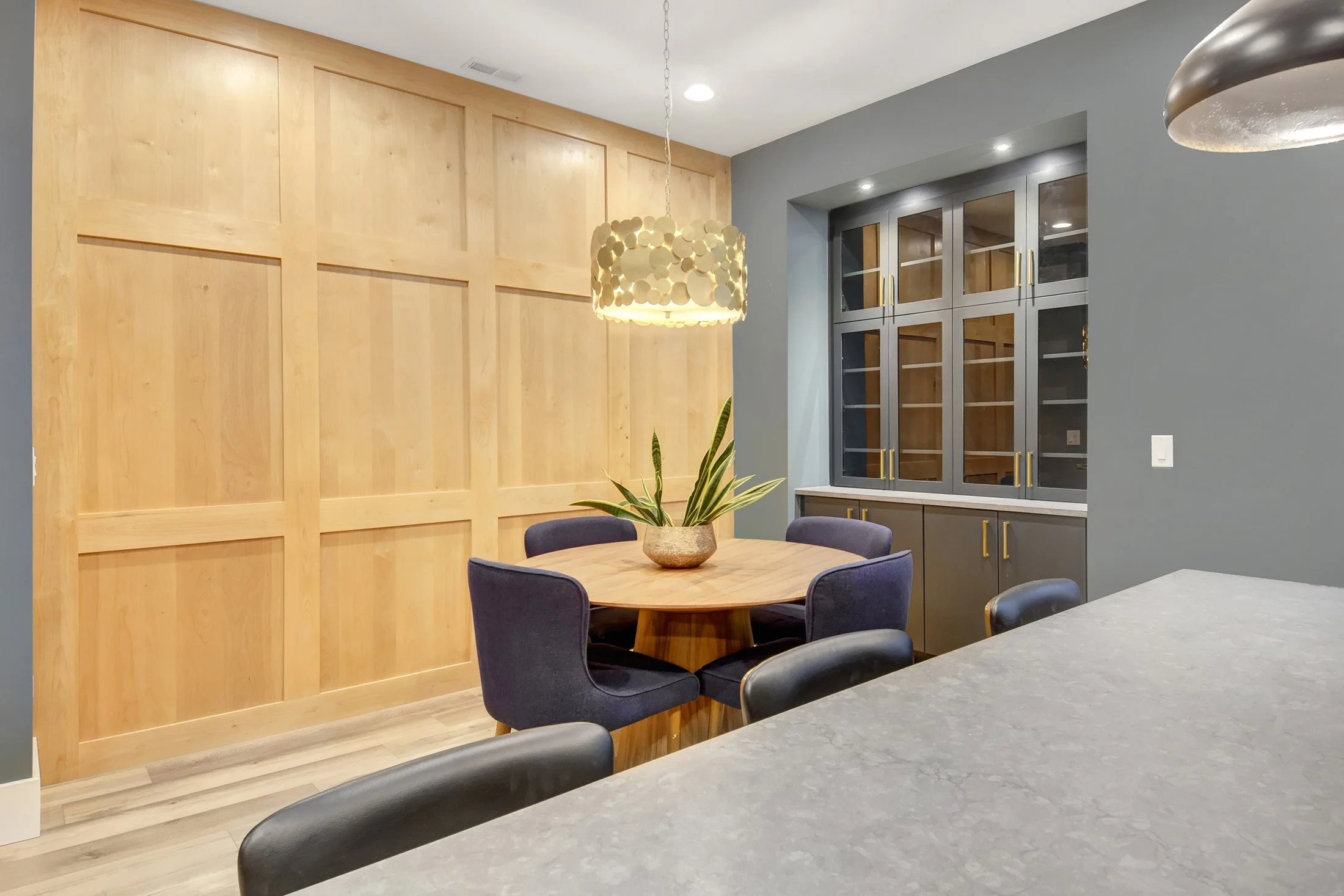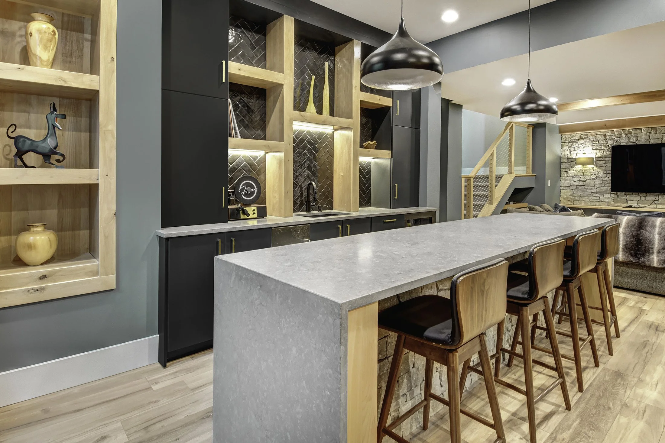 This charming farmhouse in Westminster’s Bradburn neighborhood has a unique floor plan that splits their basement into two distinct halves. The homeowners came to us to finish half of the basement - and leave the other half unfinished for storage and games. We embraced the home’s architecture - repeating the maple and cable railing at the stairs that is featured on the main level and utilizing leftover exterior stone for the TV wall to bring the outside in. From there, we created a modern, moody bar with Woodland’s onyx cabinetry and quartz that looks like soapstone. Beautiful woodwork brings warmth to the moody palette and a rich paint color adds depth and personality to this beautiful, functional family room basement.
