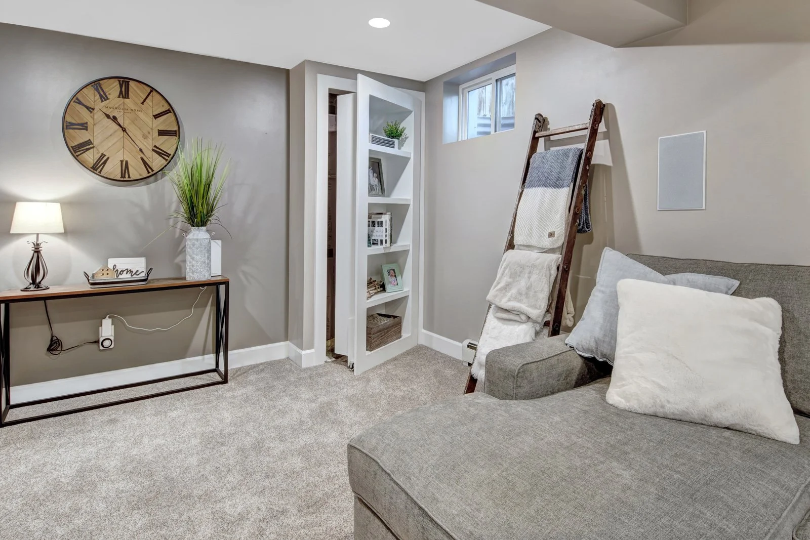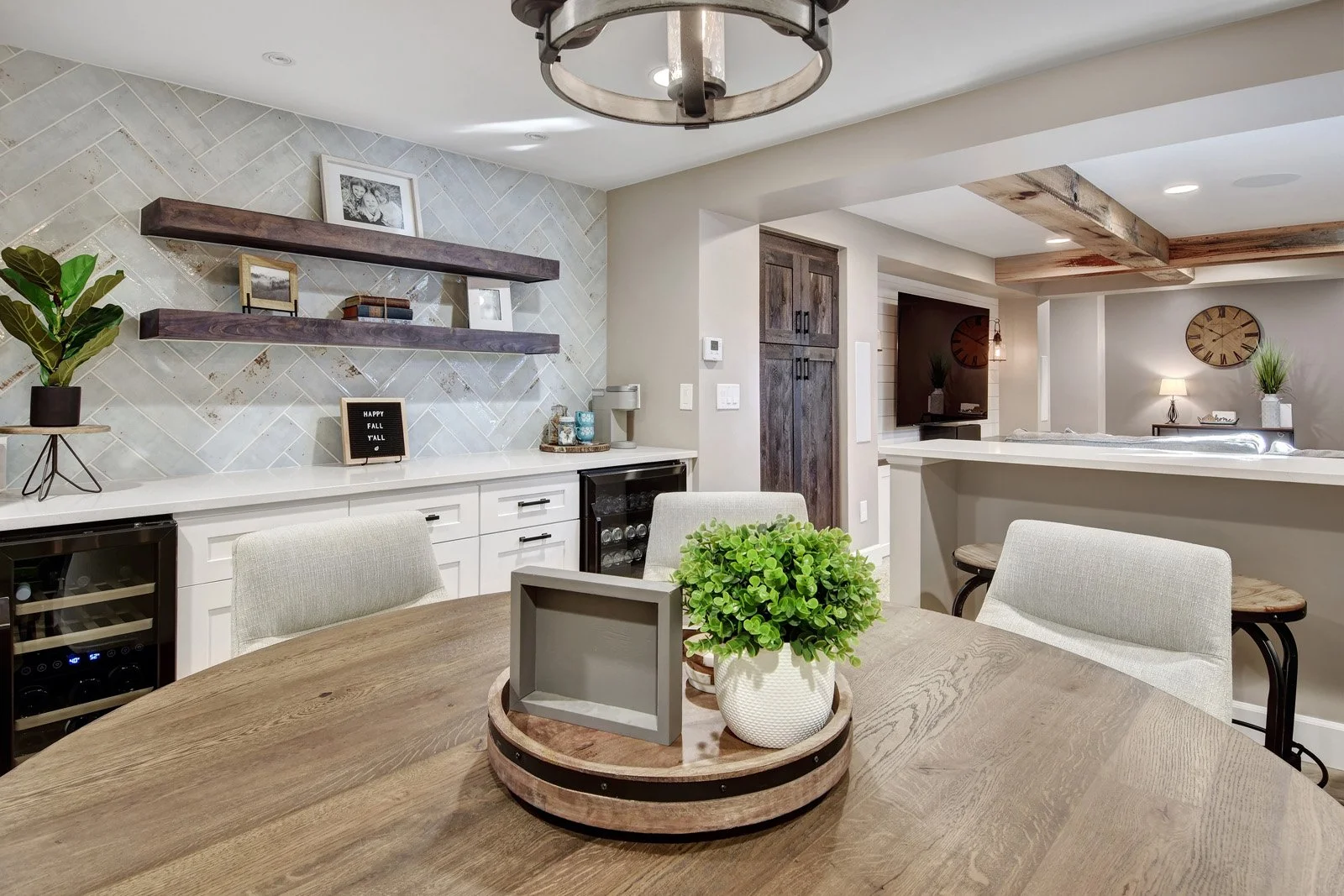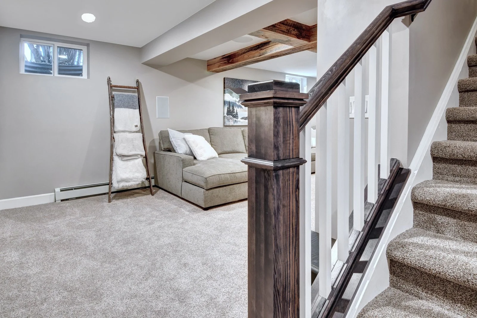 This 1970s Broomfield Country Club home was prime for a basement remodel. Our goal: Make it cozy and a place the family’s children would want to hang out in. We embraced a beam that ran across the space and made it feel intentional by adding a second one and cladding them in wood. Overall, this basement went from cold and a little dreary to warm and inviting - with a hidden bookcase door to add to the charm!