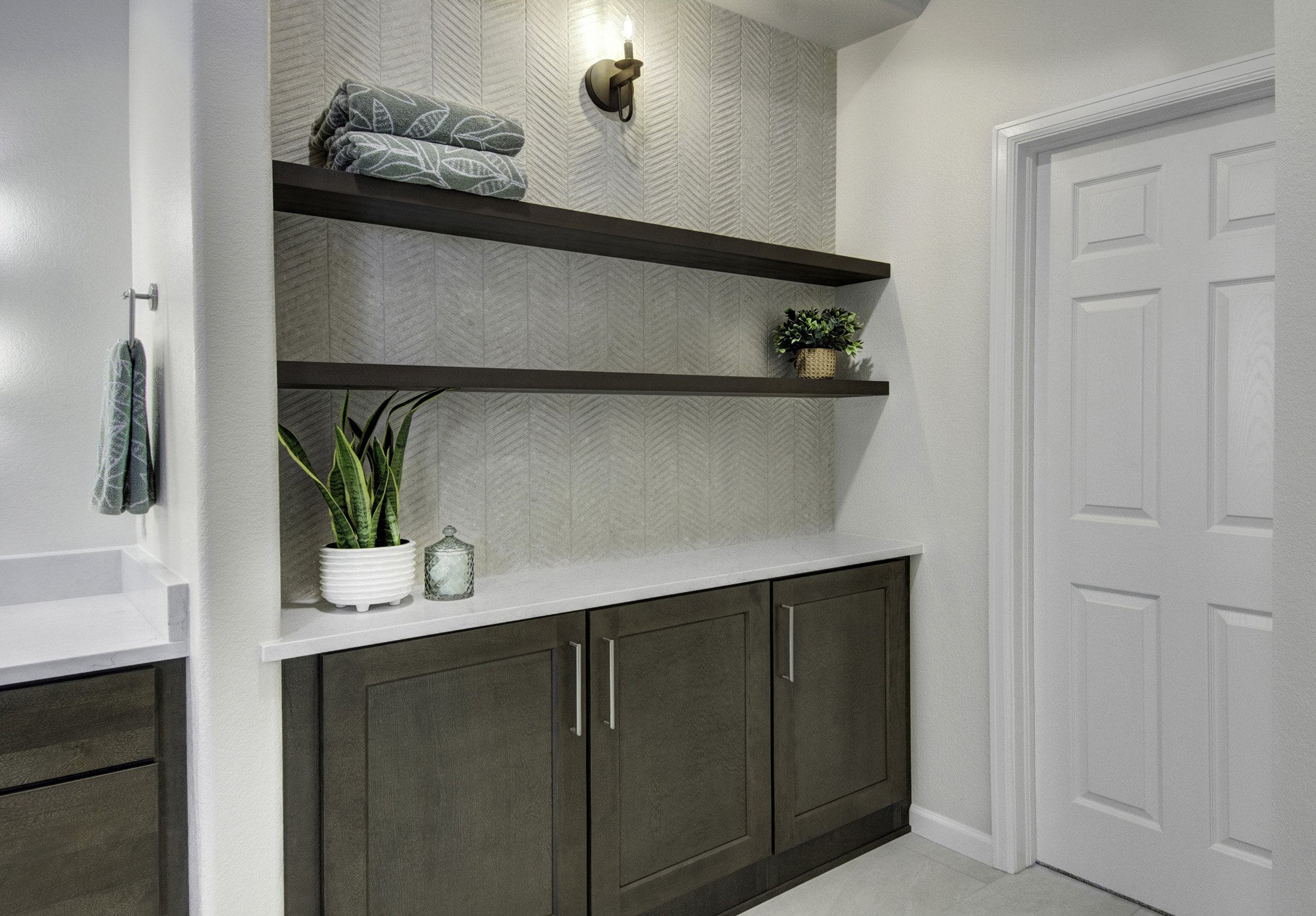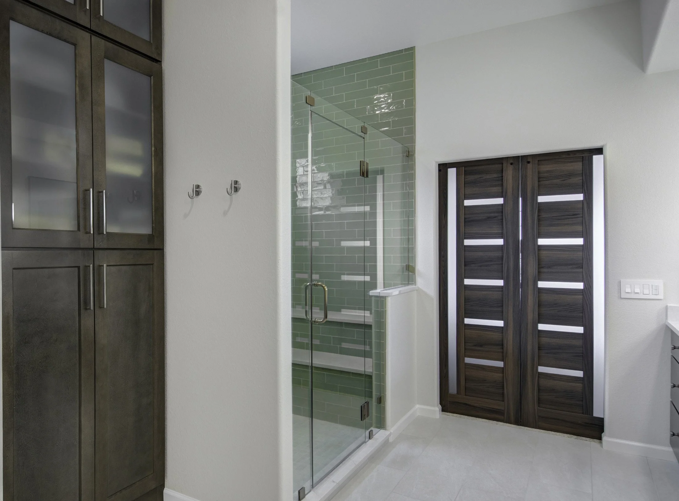 The homeowners at our Anthem Ranch primary bath project wanted to increase the size of their shower and remove the built-in tub. Sound familiar? The challenge in these spaces built in the early 2000s is that replacing a tub and shower with one giant shower can create a space that feels vast and cold rather than spa-like. We created a large, luxury shower but used some of the space for built-in storage for linens. Adding built-ins to a bathroom can take a space that tends to feel cold and sterile and add character and warmth. Green shower tile, dark wood cabinetry and a textured Porcelanosa tile are the icing on the cake.