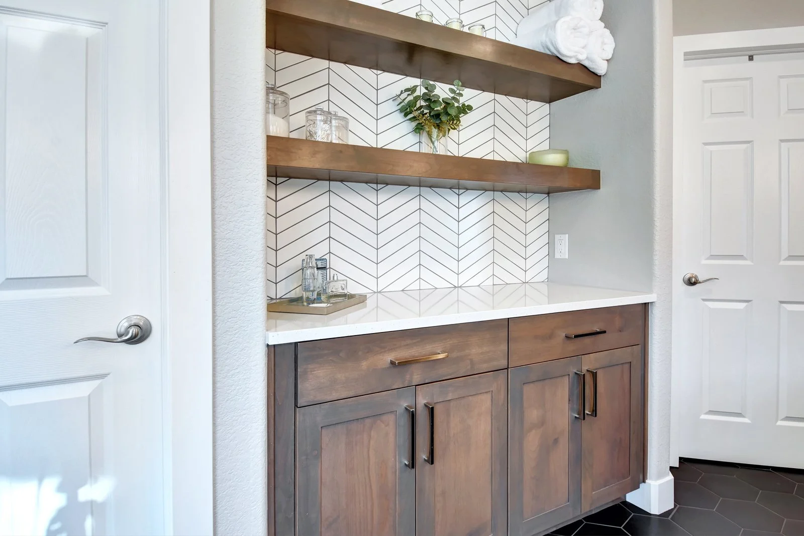 We replaced the large built-in corner tub with a freestanding tub, extended the shower to give it a larger footprint and created a double vanity to free up linen storage where a separate vanity used to sit. The result is a stunning space that embraces contrast while still feeling serene.