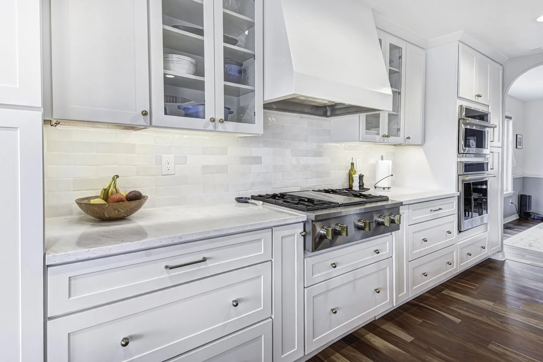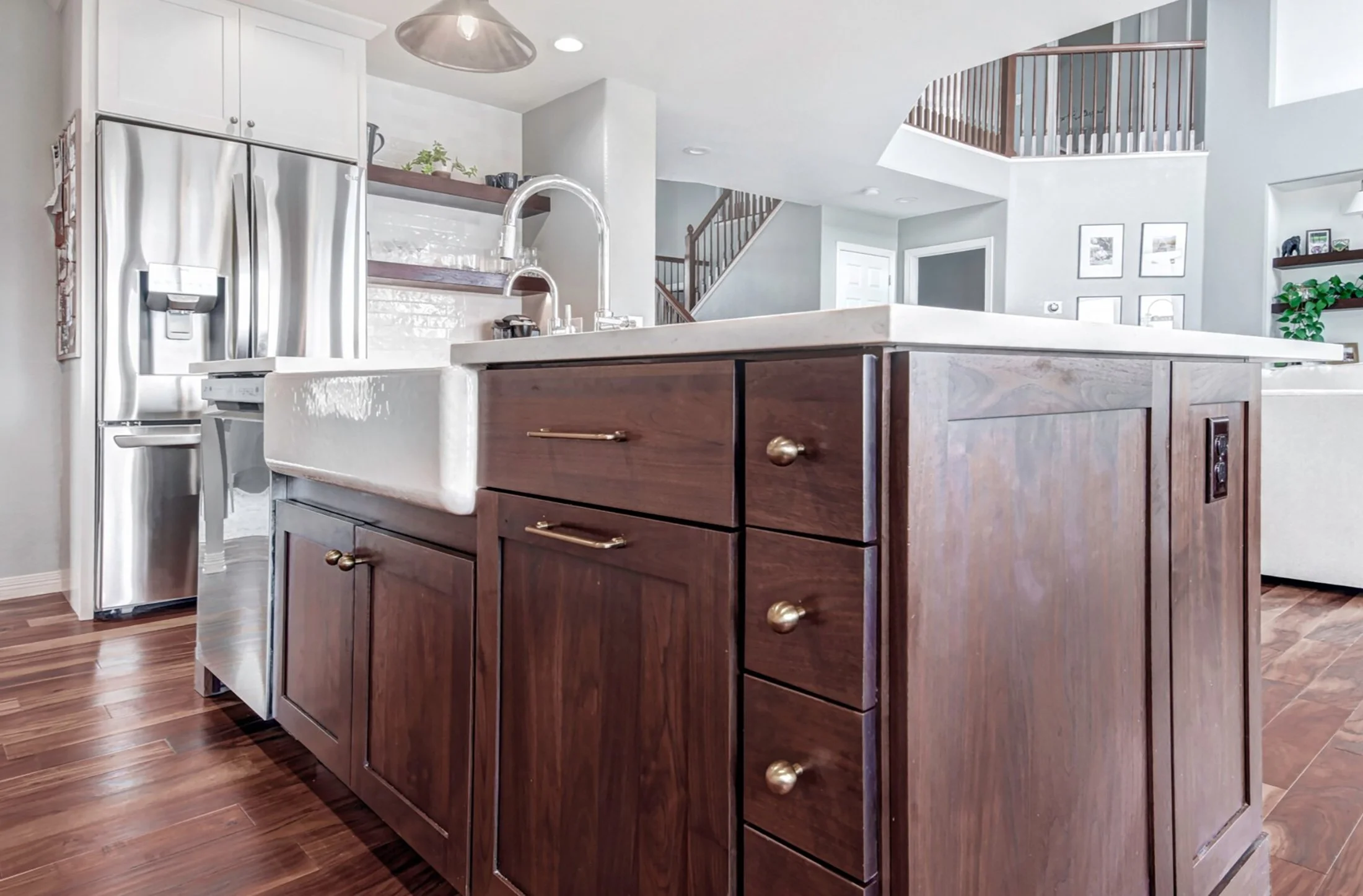 Raise your hand if your honey oak kitchen and boomerang shaped island time stamps exactly when your home was built - and creates difficult spaces to move and place furniture around. These homeowners in Broomfield’s Broadlands neighborhood called us to help create a space that not only gave them more storage and better flow between the kitchen, family and dining rooms, but also created room to place furniture in the nearby family room. The homeowners’ transitional, timeless aesthetic fit the overall style of their home.
