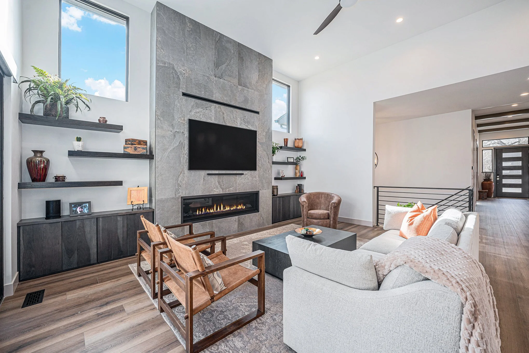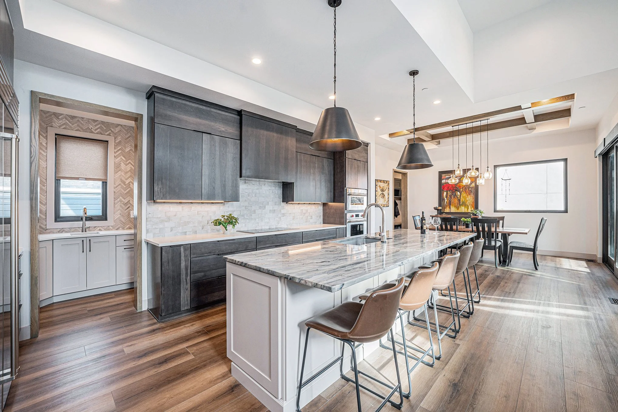 We were hired by the homeowners on this project to review their architectural plans and make suggestions to the overall design and layout to improve flow and function. We spent time optimizing the kitchen, butler’s and pantry for organization and helped to select finishes for this warm, modern home at the foothills of the Rockies. Build by SummitRidge Custom Homes.